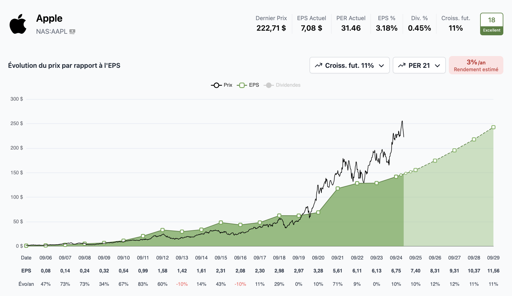 ✅ Le rendement total estimé en temps réel sur les 5 prochaines années (ex. : 3% pour Apple, 9% pour Microsoft).